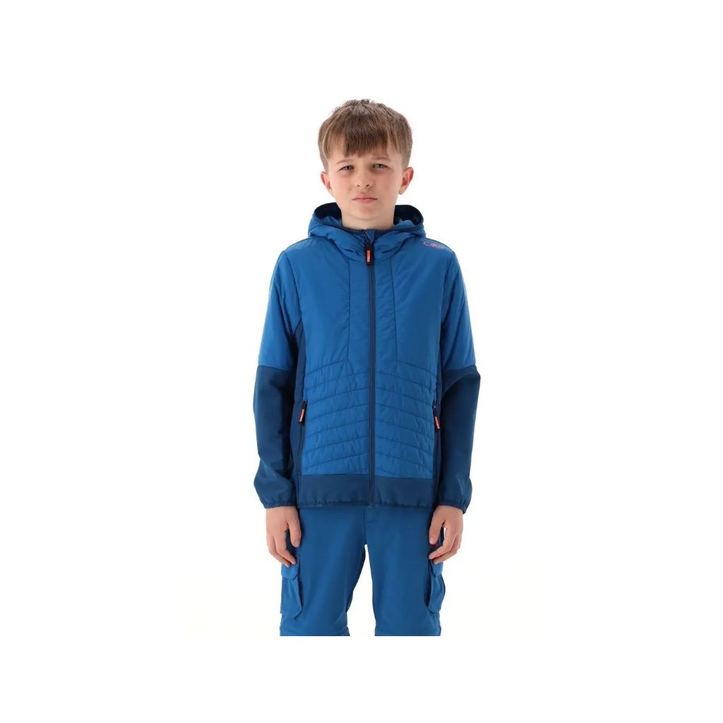Chlapčenská hybridná bunda CMP s kapucňou kombinuje ľahkosť a funkčnosť pre aktívne deti. Predná časť bundy je zateplená syntetickou výplňou Feel Warm Flat, ktorá poskytuje výbornú tepelnú izoláciu, zatiaľ čo rukávy a zadná časť sú vyrobené z elastického materiálu pre pohodlie a voľnosť pohybu. Vysoký golier a integrovaná kapucňa chránia pred vetrom a chladom. Bunda je vybavená dvoma praktickými vreckami na zips a pružnými manžetami, ktoré udržia rukávy na svojom mieste.