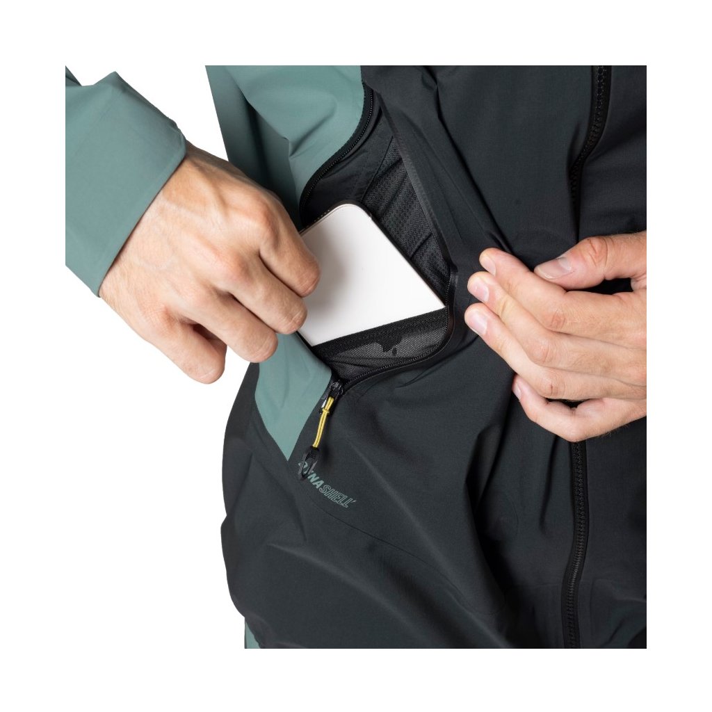 Materiál: CSR PFC-free; Pocket Lining WARPKNIT MESH POLYGIENE 90 g/sqm (100% Polyester (recycled)); Main material DYNASHELL TRANSALPER ECO 102 (100%Polyamide )