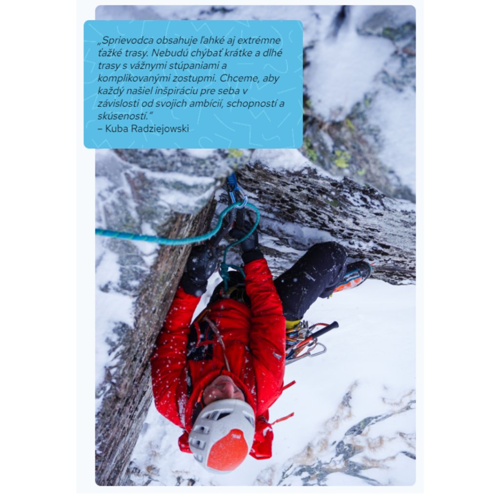 - pikošky a zaujímavé príbehy o lezení - každá nová kapitola sa otvára príbehom o zaujímavých udalostiach alebo dôležitých postavách zimného lezenia.